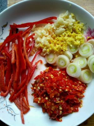 准备的食材有剁碎的泡椒.大葱.姜沫.蒜沫.红椒丝。
