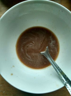 准备一个碗,将一勺料酒,一勺醋,一勺淀粉,1.5勺糖,一勺生抽,一点点老抽,老抽主要是为了调色,几滴香油,盐,放入碗中,加适量的水,搅拌均匀!这里缺张照片用我女儿的代替啦