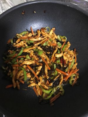 重新起锅放少量油,蒜片炝锅,这里什么都不用放,将胡萝卜和青椒炒至七成熟放木耳,然后倒入调好的一碗汤汁,最后将提前炒好的肉丝倒入,大火收汁