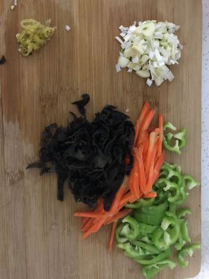 葱姜蒜准备好,尖椒萝卜木耳切丝,我还放了一颗泡椒,爱吃辣可以多放