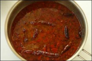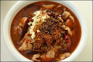 锅中加油烧热,加入花椒、干红辣椒爆香锅,再加入郫县豆瓣酱翻炒出香后加少许料酒,然后加水成红汤。