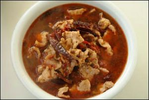 锅内放油,放入肉片炒至变色,加入泡椒翻炒几下,然后加入鲜麻椒和开水,大火烧开;
