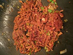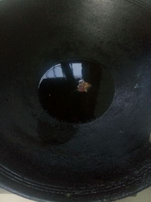 油烧至七成下入一汤匙郫县豆瓣酱,葱姜蒜沫.