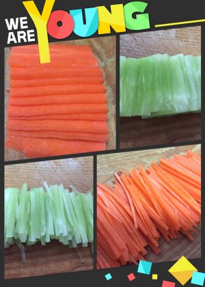将胡萝卜,青笋,木耳改刀切丝,青笋略比胡萝卜粗一些.