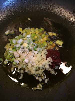 锅中放少于油放胡萝卜 炒两分钟后 加入两勺豆瓣酱 翻炒 加入葱姜蒜末和柿子椒木耳 继续翻炒