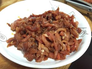 将肉切成丝加入玉米淀粉,一颗鸡蛋清,少许陈醋拌匀待用.
