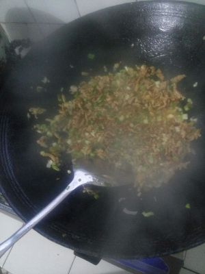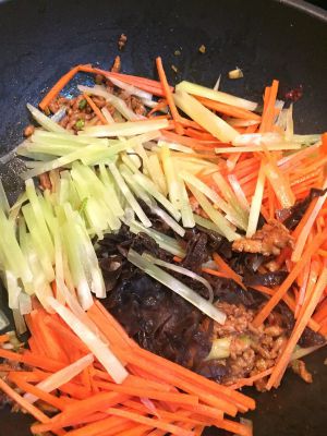 加入切好的胡萝卜丝,青椒丝翻炒3分钟
