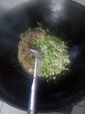 锅中放入少量的油 把腌制好的鸡胸肉丝放入锅中 炒至肉变白色(或者8分熟) 盛出备用