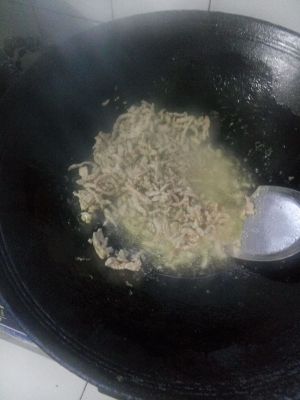 将锅置于中火上加入色拉油60克烧热,将切好的肉丝放入锅中翻炒1分钟
