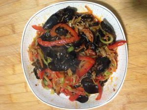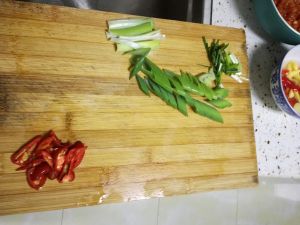 将黑木耳,青椒,胡萝卜切丝,按理说应该还有笋丝,可惜我没有,所以就用蒜苔凑数了