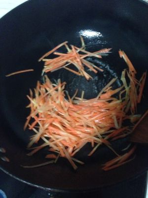 胡萝卜变色后倒入肉丝、彩椒和木耳翻炒