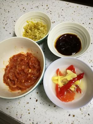 把肉切丝,用少许料酒,辣椒酱,淀粉,蚝油,蒜末拌匀后放冰箱冷藏一会儿,准备一勺泡椒泡姜(这个我以前的菜谱有它的制作过程,很简单的!)