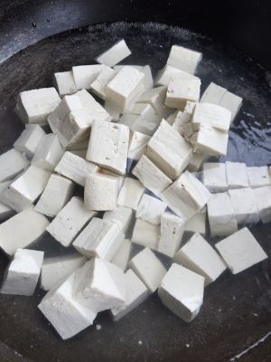 豆腐切小块,放水里煮,放盐。水开就沥出来,备用