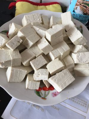 将豆腐切成2cm左右的方块,用开水泡一下去除豆腥味;