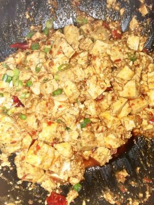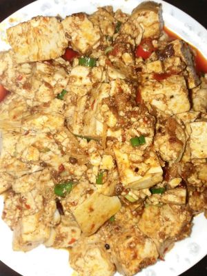 先热锅,然后再倒些食用油,再把鱼肉末倒下去,加上点盐,酱油,翻炒一下.现在就可以下豆腐,再倒些辣椒酱.盖上锅盖一会儿直到豆腐入味热到里面后就好啦.最后打开锅盖,把准备好的芍汁(酱油和生粉融合一起)倒入豆腐,用锅铲推炒,翻一翻,不过小心把豆腐弄得太碎了.