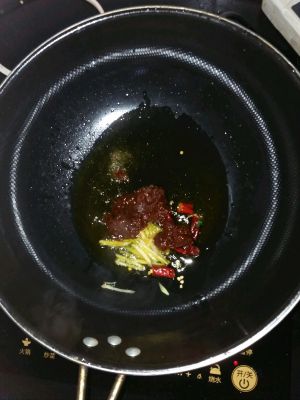 热油葱姜干辣椒爆香,放入酱料炒香