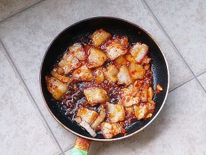 热油锅入肉片煎炒,至肉片表面微卷。转中小火,入大半勺郫县豆瓣酱,蒜末爆香,炒出红油。入小半勺甜面酱炒匀入味。加1勺料酒,1勺炖肉汤汁。