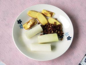 材料1:姜切片,大葱切段。花椒1小把备用。