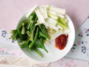 材料2:炖肉的同时,青椒斜切开,大葱竖切丝,蒜拍碎。郫县豆瓣酱,甜面酱备用。
