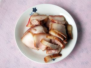 把五花肉在锅中煮个八分熟,煮的过程可加几片姜和一颗八角,