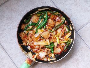 肉香四溢后转大火,入青椒,大葱丝煸炒至熟,加适量盐调味。关火。