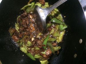 放入豆干、青红辣椒翻炒片刻,出锅控油。