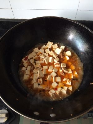 放豆腐翻炒一下,然后加适量的水,把豆腐闷2分钟。