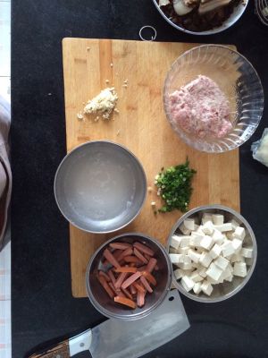 先将五花肉剁成肉末,葱切小段,豆腐切成小方块;