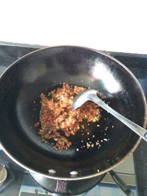 加入半熟的肉末,加适量水,大火煮熟,加入老抽,豆酱,辣椒酱,翻炒均匀;