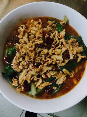 撒上葱蒜沫花椒红辣椒,油泼即可。