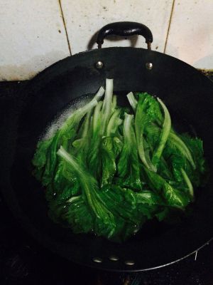 锅上烧水,把油菜抄熟放在准备盛菜的盆底铺好
