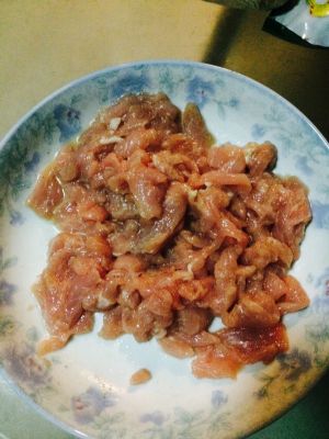 我买的是猪里脊肉,做出来会嫩一些。像这样片成薄片,加香油,料酒,嫩肉粉,少许盐,味精,胡椒粉,腌制10分钟。
