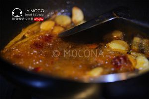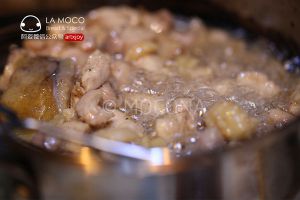 起油锅,油稍稍多一些,把鸡块放入煸炒,将鸡肉里的水分炒出,炒至干香, 盛出。