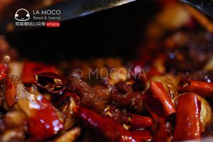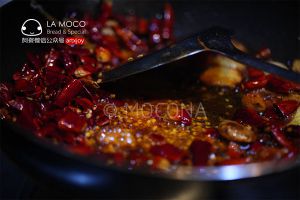 3.油锅里小火爆香姜,蒜片,葱段,干红辣椒、花椒。 倒入鸡块,放入干锅酱,鸡精,继续煸炒五六分钟即可。