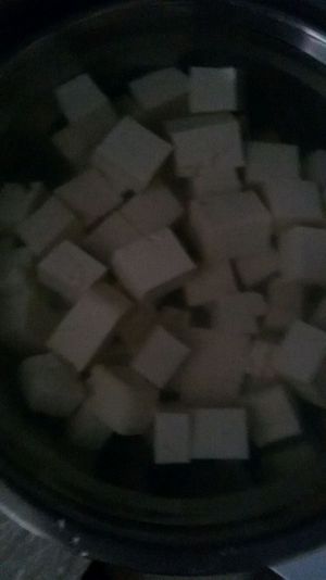 烧水,加少许盐,豆腐切块,水开后豆腐块放入锅中,煮两分钟。备用。