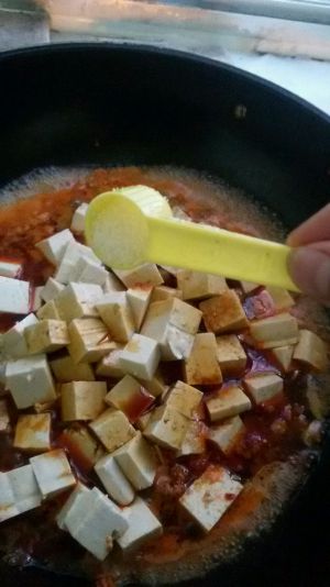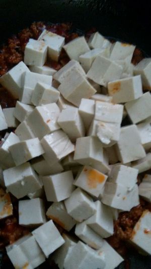 油热锅,炒肉馅至发白,盛出。锅中剩余油继续加热,放入辣椒碎,蒜末,炒香后先后放入辣椒酱,肉末,豆腐,加入生抽,少量水。直至汤汁快没,关火,加味精。