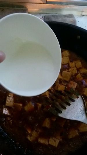 淋入水淀粉,用锅铲轻轻推到豆腐,至汤汁浓稠关火