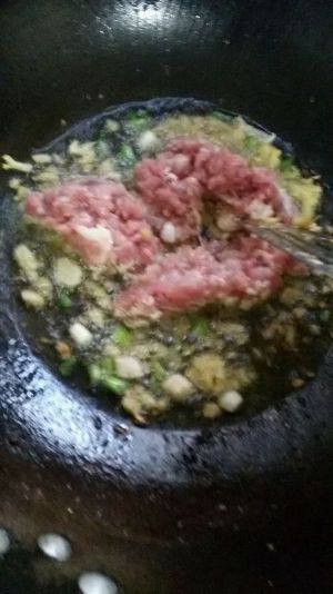 食材都准备好了,接下来热锅下油,下猪肉末,中火爆香,