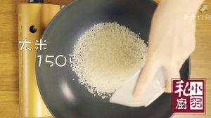 先把大米洗净晾干,然后取不粘锅,开小火。