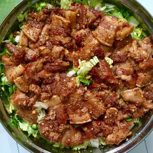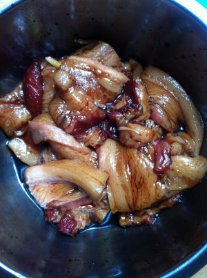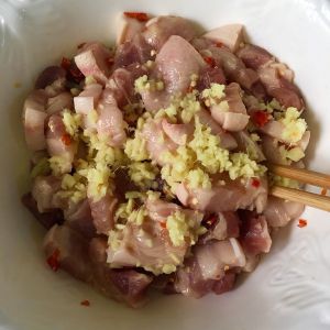 五花肉切厚片,放生抽,盐,耗油,鸡精,少量南乳汁腌制4小时
