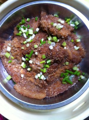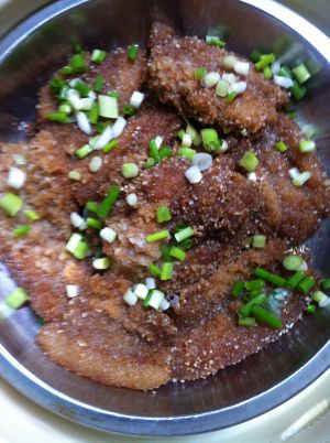 出锅啦,家里有小葱的可以切点葱末撒在上面,超级香超级好吃的粉蒸肉就完成啦~~额。。请原谅我的拍照技术和摆盘技术,我已经尽力了,大家就凑合看吧