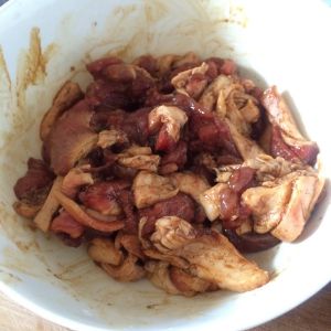 切好的肉片放入碗里,加入老抽、料酒、生抽(比例为1:1:2)、胡椒粉、花椒粉搅拌均匀,腌制30--40分钟入味。花椒粉可加可不加