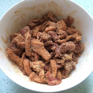 腌制够时间后,把蒸肉粉倒入碗中,搅拌均匀,让每一片肉片上都均匀沾上蒸肉粉。