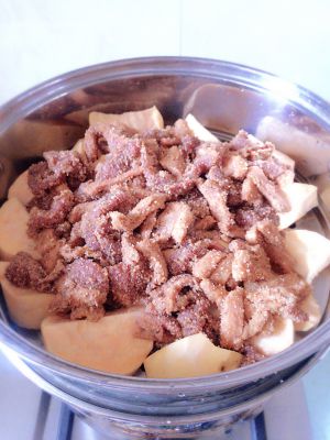 红薯片铺盘底,腌制好的五花肉两面沾上米粉,平铺到红薯片上,将多余的米粉最后撒在肉上,然后淋少许水(蒸制过程中,肉上的米粉会吸水,这样粉蒸肉才会糯口,不淋水会发干),上蒸锅