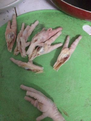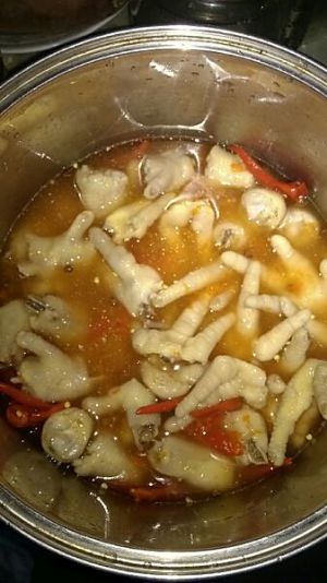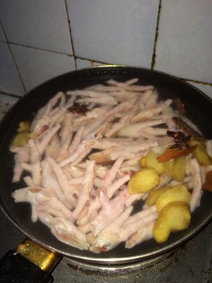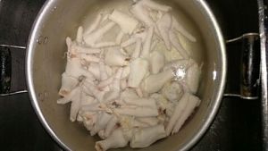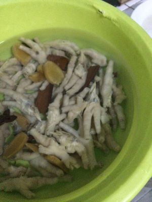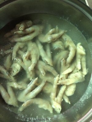 买来的凤爪去掉指甲,剁成小块,用凉水冲洗三到四次,锅中加入凉水和花椒, 水开以后放入凤爪 加些料酒去腥味,煮10到15分钟