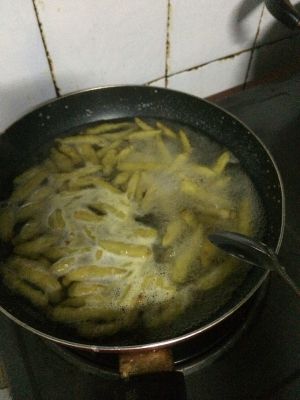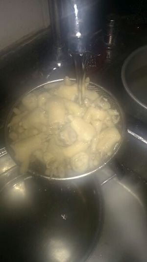 冷水入锅,加生姜,料酒煮6--7分钟(喜欢熟一点的可以适当延长一两分钟,但是那样吃起来不是很脆)然后用冷水冲洗,洗净,剁成两份