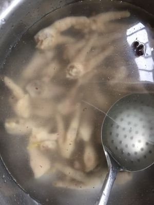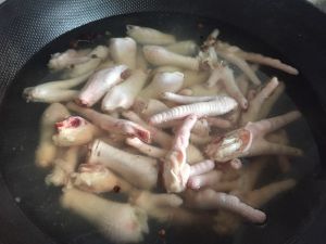 将鸡爪洗干净,用剪刀剪去指甲,将每个爪切成3段,用水焯一下,去浮沫腥味,洗干净和凉水下锅加花椒葱段姜片,开锅后15分钟。煮熟的爪用凉水冲洗干净后放入冰水(凉开水或矿泉水)中泡一会