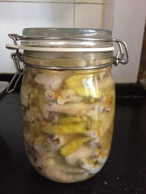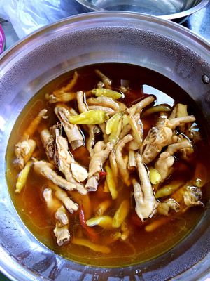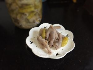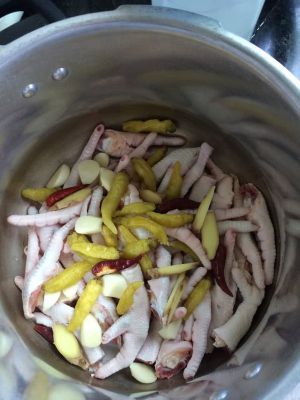 白醋,(喜欢酸的可以多放一些)焯好的配菜,凉白开一小碗,味精适量,白糖少许,连同泡椒、鸡爪一起装入容器中,容器必须无水无油。封好放冰箱冷藏8小时左右。酸脆入味……