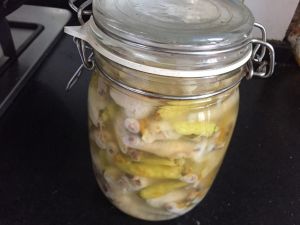 把容器洗干净,用开水泡一下倒掉,或者完全擦干净,这样不容易坏。一层鸡爪一层泡椒放进罐子里,把泡椒的水,凉开水,盐,白醋混合,倒进容器,让水没过鸡爪。