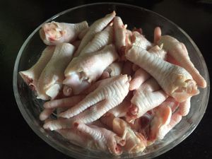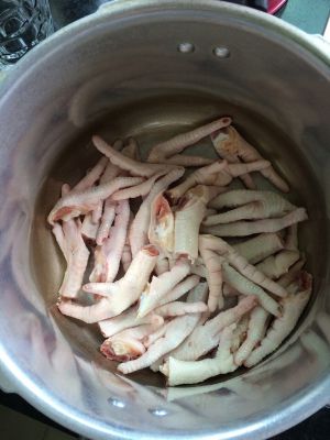 鸡爪洗净切小段,剪去鸡脚趾甲